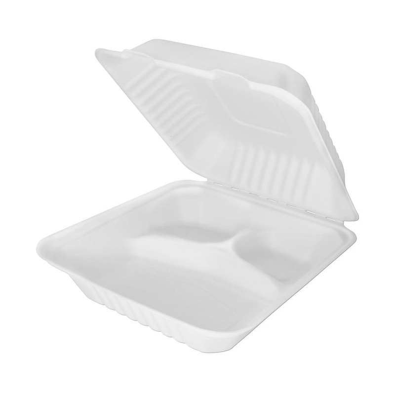 Envases Biodegradables con 3 compartimentos con unas medidas de 23x23x7,8cm. Están fabricados en caña de azúcar, conocidos como cajas para hamburguesas y patatas. Son 100% Biodegradables y Compostables, la mejor alternativa para respetar el medio ambiente y la naturaleza. Se pueden comprar en paquetes de 50 unidades o cajas de 200 unidades. Aptos para microondas.