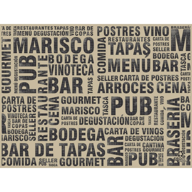 Manteles Individuales de Papel Ecológicos diseño Gastro 30x40cm. Estos Manteles Individuales están fabricados con papel de 40gr, conocidos como manteles de papel para restaurantes. La alternativa en manteles individuales más económica y ecológica. Se pueden comprar en paquetes de 500 unidades o cajas de 1.000 unidades.