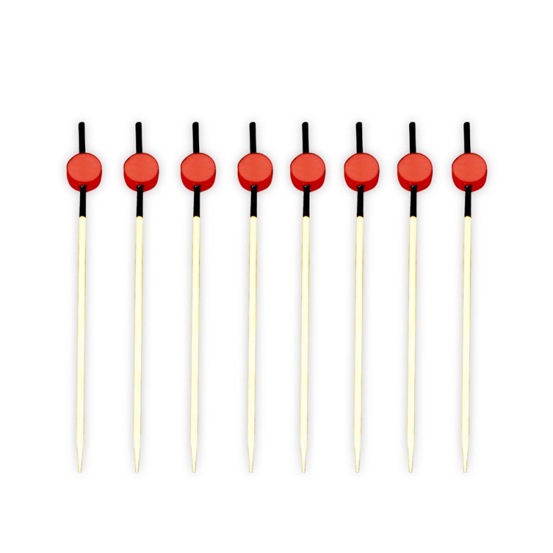 Pinchos de Bambú con decoración en rojo y negro de 12cm, estos pinchos están fabricados en madera de bambú natural, también llamados brochetas de madera desechables. Son 100% Biodegradables y Compostables, la mejor alternativa para respetar el medio ambiente y la naturaleza. Se pueden comprar en paquetes de 200 unidades o cajas de 1.000 unidades.