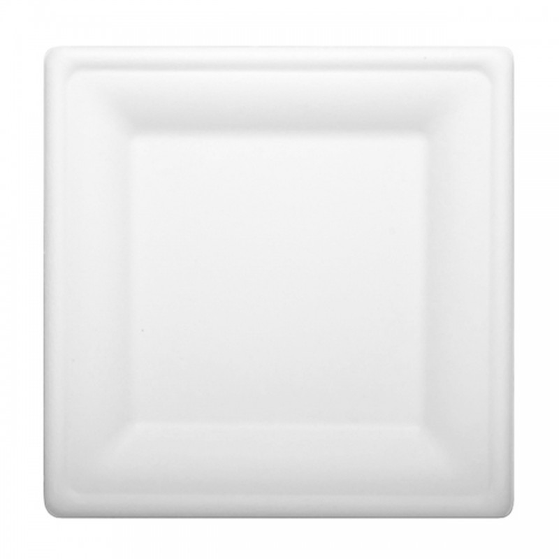 Platos Desechables Cuadrados Ecológicos de 26 x 26 cm fabricados en caña de azúcar, son muy resistentes y aptos para uso alimentario.
