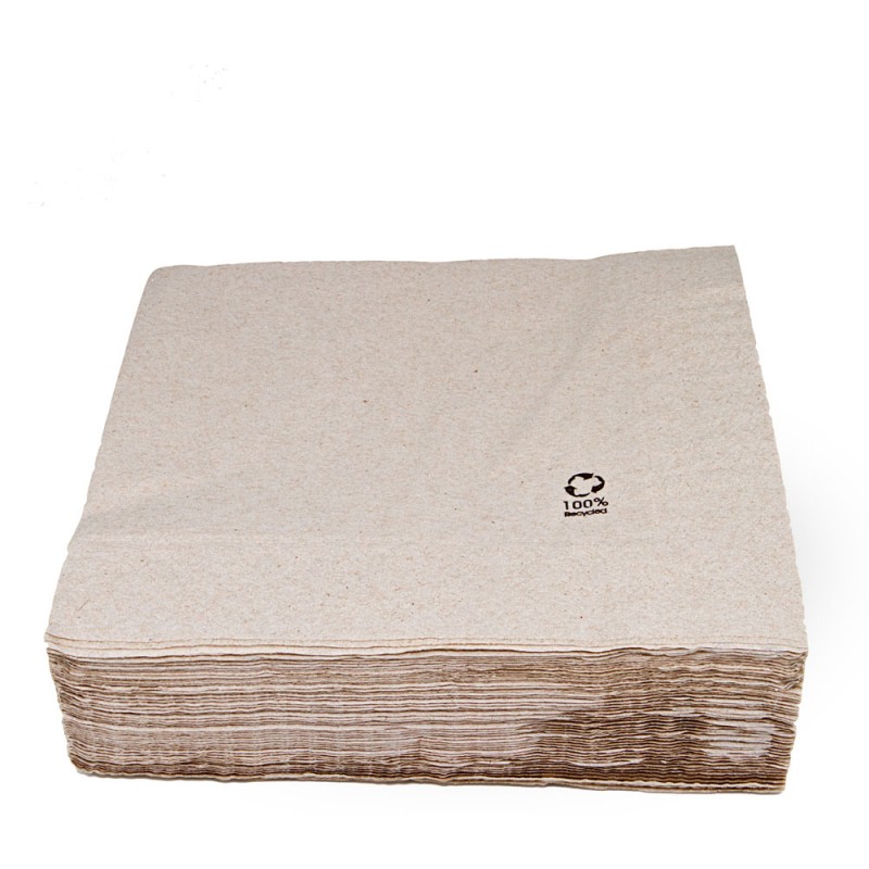 Servilletas de Papel Ecológicas de 40x40cm (20x20cm plegada) de 2 capas, estas Servilletas Desechables Ecológicas están fabricadas con celulosa 100% reciclada, conocidas como servilletas kraft recicladas. Son Biodegradables y Reciclables, la mejor alternativa para respetar el medio ambiente y la naturaleza. Se pueden comprar en paquetes de 100 unidades o cajas de 2.400 unidades.